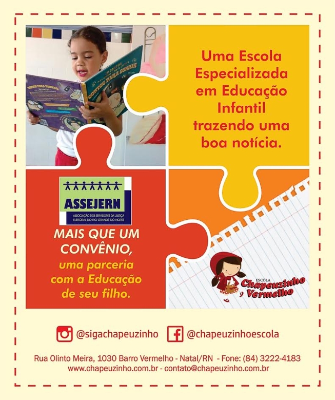 Temos a satisfação de informar que a ASSEJERN firmou convênio com o Jardim Escola Chapeuzinho Vermelho, localizado na Rua Olinto Meira, 1030, Barro Vermelho, Natal/RN.Pelo Convênio o associado terá desconto de 10% nas parcelas da anuidade escolar referentes à Educação Infantil e 1º no do Ensino Fundamental.